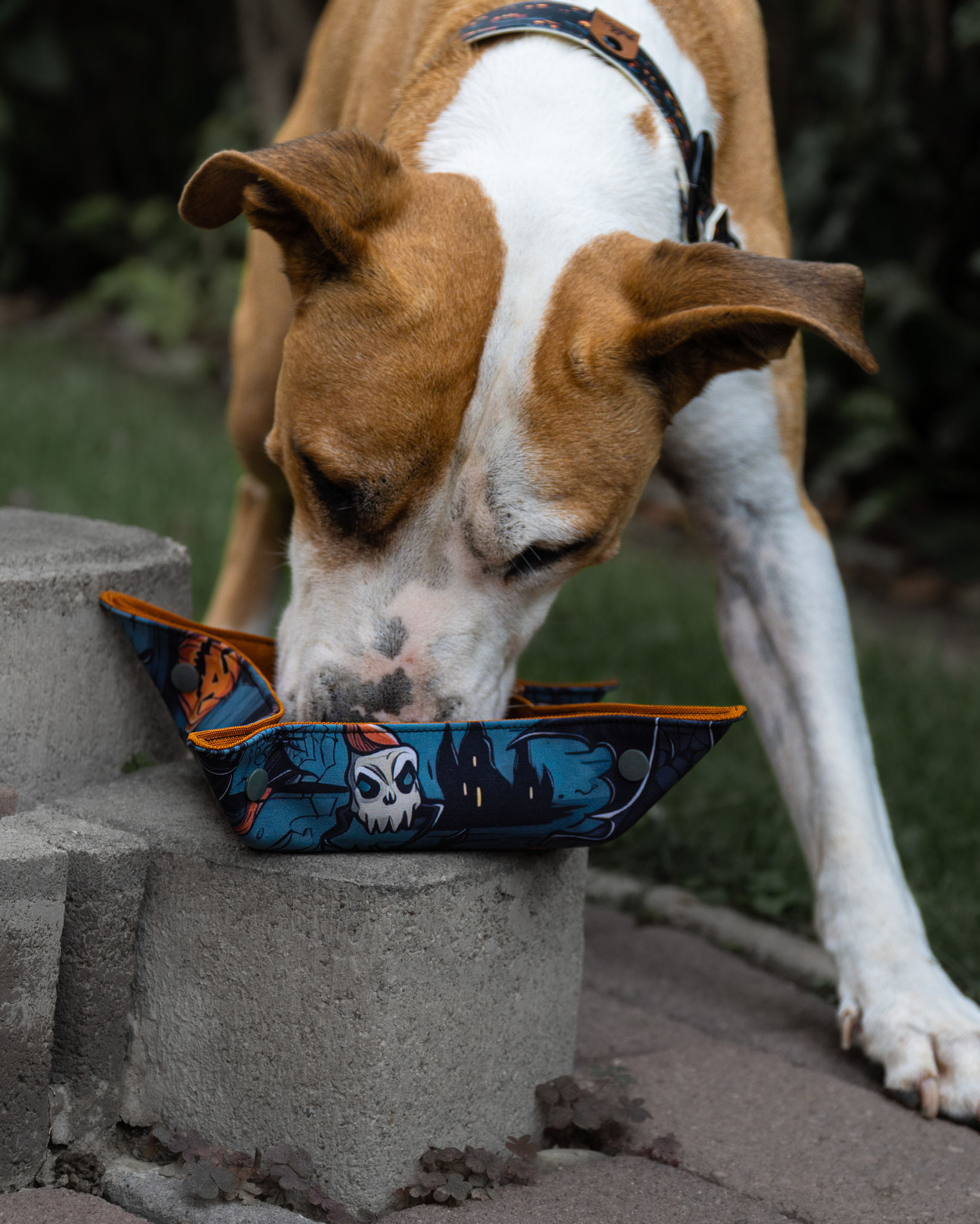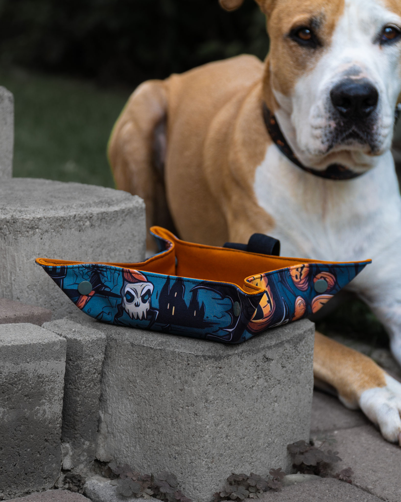 Faltbarer Hundenapf aus Outdoorstoff mit Druckknöpfen zum einfachen zusammenfalten. Der Innenstoff ist ebenfalls wasserabweisend und geeignet für Hundefutter und Wasser. Mit Aluminium-Karabiner leicht zum Mitnehmen und anklipsen.