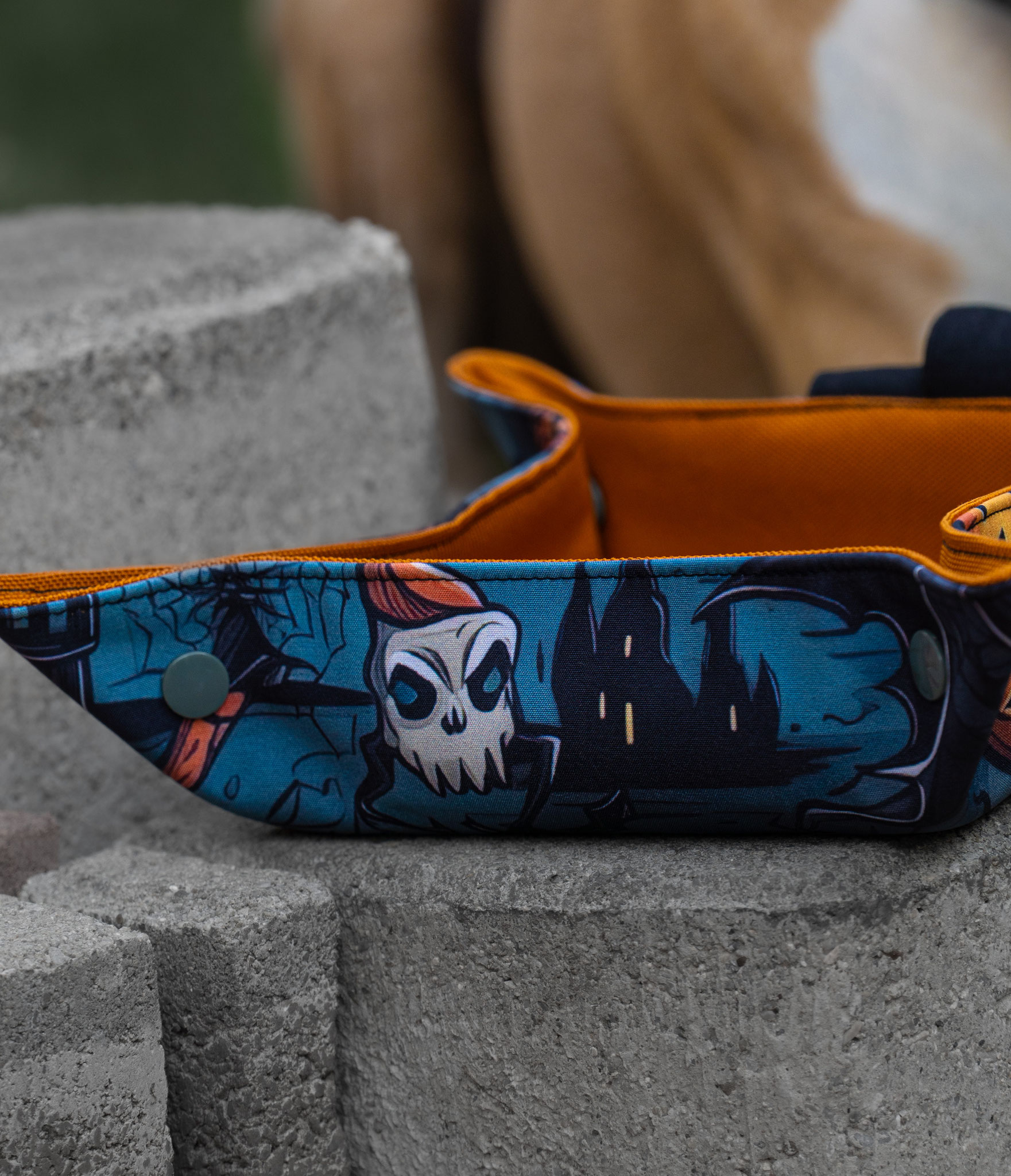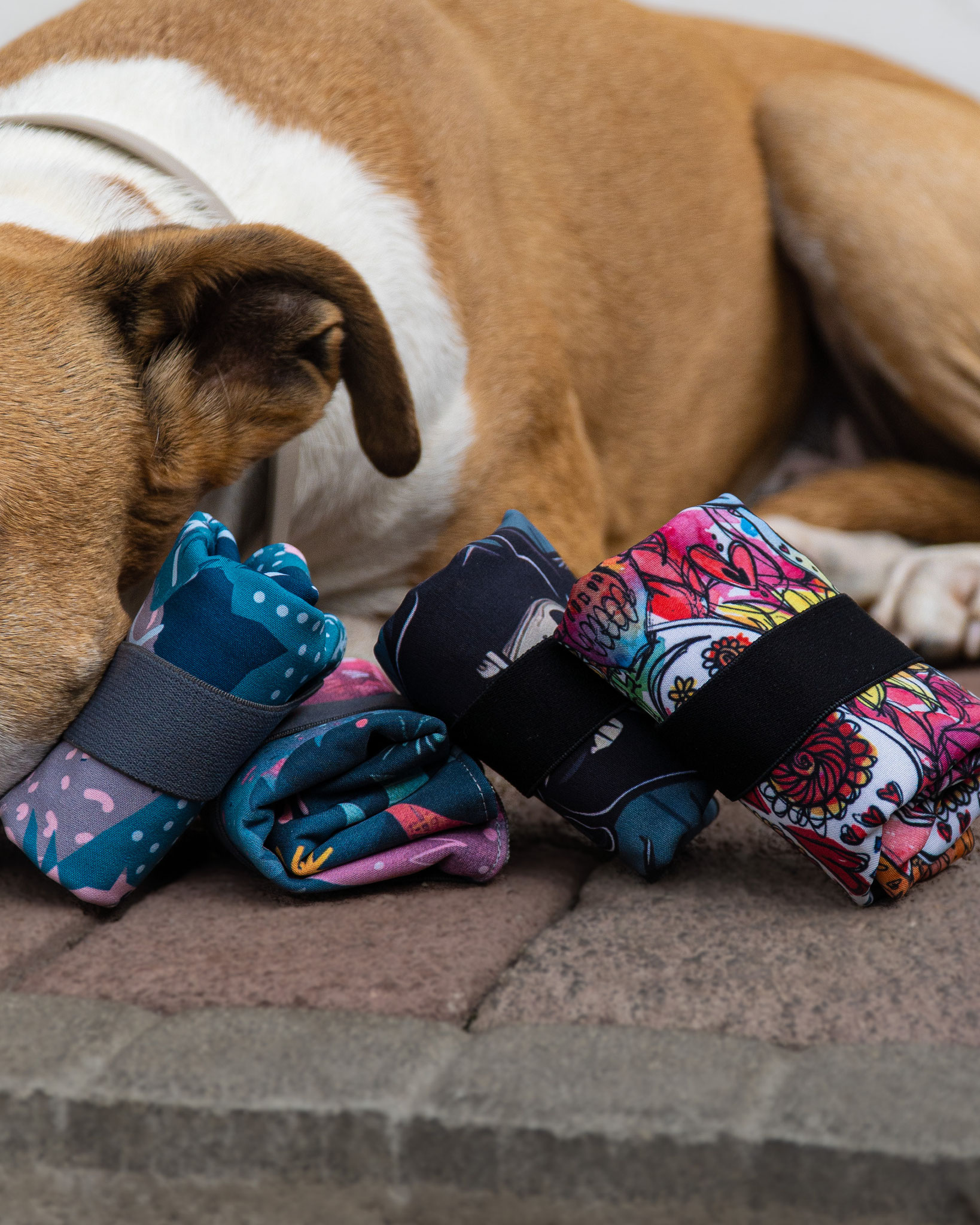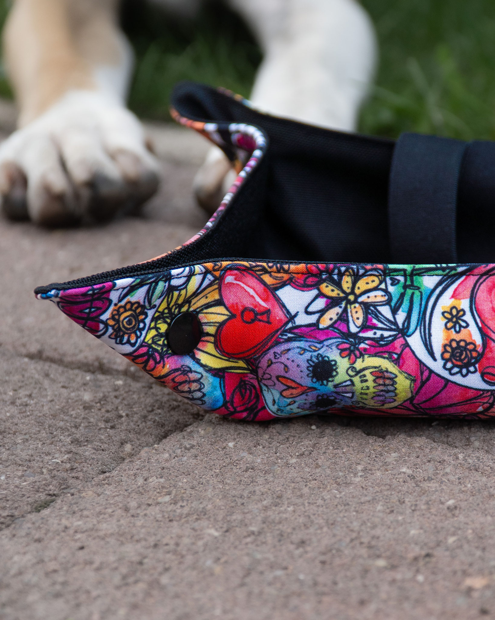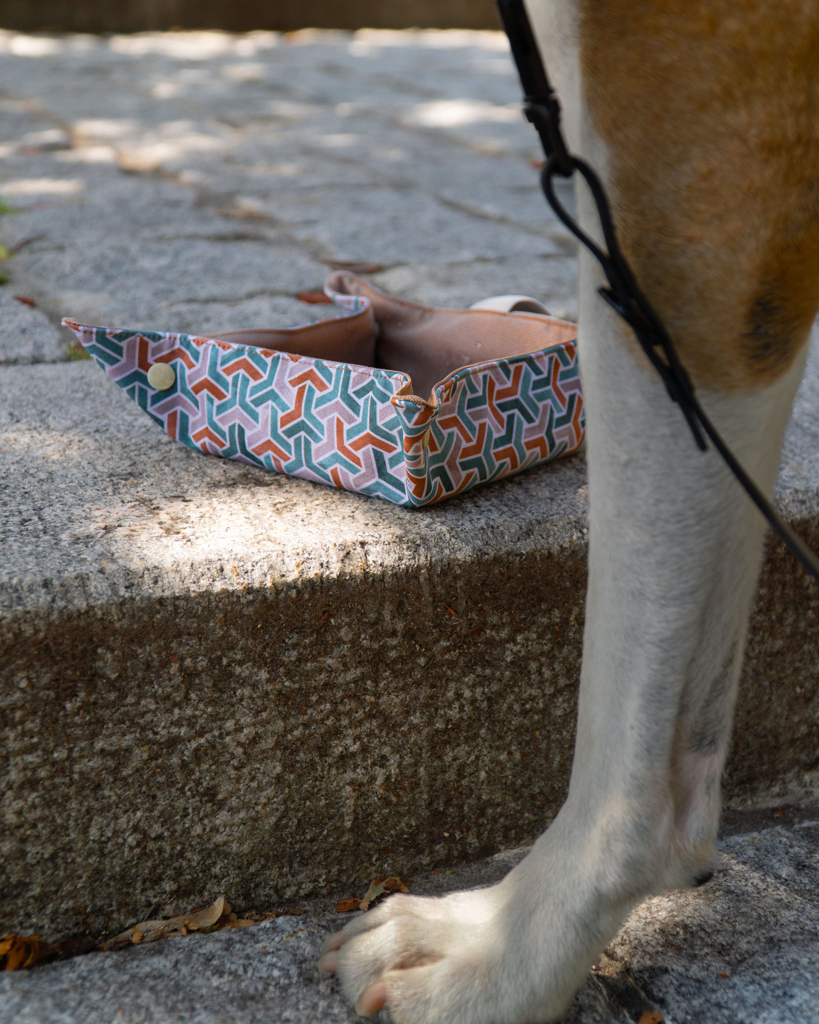 Kleiner leichter Wassernapf der quasi null Platz im Rucksack oder in der Tasche einnimmt. Einfach die Druckknöpfe zusammenklipsen & deinen Hund daraus trinken lassen. Der Napf kann dann dank dem fix eingenähtem Gummizug jederzeit zusammengefaltet und platzsparend verstaut werden.